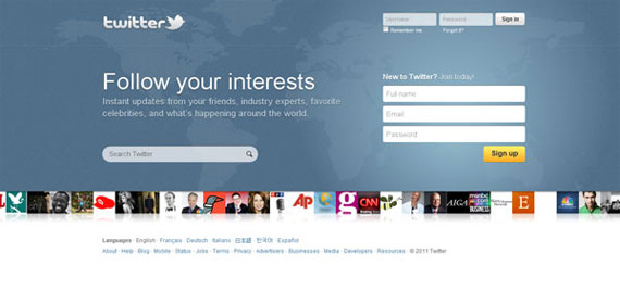 Главную страницу Twitter.com видят пользователи, не авторизованные на сервисе. Twitter отказался от традиционной светло-голубой цветовой схемы и изменил ее на стальную синюю. Исчез обновляемый блок со списком популярных твитов (Top Tweets), а поисковая строка переместилась в нижнюю часть экрана. Под строкой расположилась горизонтальная лента с аватарами популярных микроблогеров.