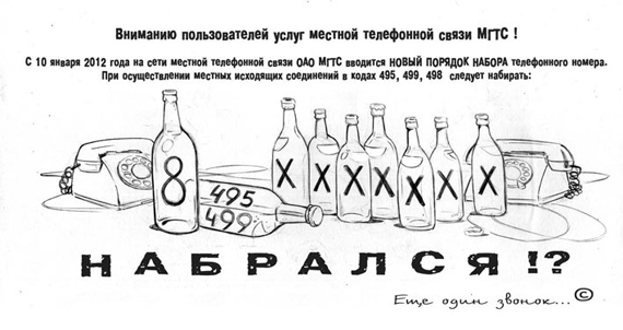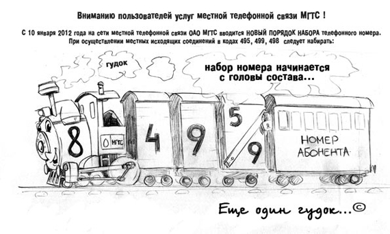 С 10 января 2012 года при наборе номера телефона, работающего в кодах «495», «499» и «498», должен быть использован единый десятизначный формат телефонного номера вызываемого абонента. Другие словами, теперь всегда будет нужно набирать восьмерку, код и номер телефона. Переход на новую систему набора проходит в рамках перехода на цифровую связь, который должен быть завершен к концу этого года.