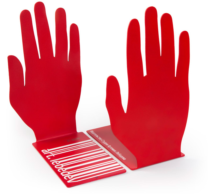 После долгих интелектуальных поисков, выбор пал на держатели «Либрастат», которые выполнены ввиде правой и левой руки красного цвета.