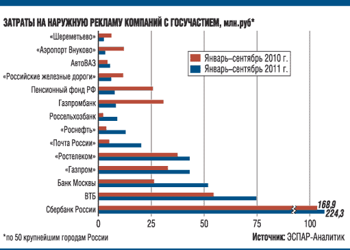Лидером по затратам на наружную рекламу среди компаний с госучастием в январе—сентябре 2011 года с показателем 224,3 млн руб. (здесь и далее оценочные данные) стал Сбербанк. Это на 32,8% больше затрат аналогичного периода прошлого года, тогда банк тоже занимал первую строчку в этом списке. Меньше всех на рекламную кампанию тратится Шереметьево — 2,5 млн руб. за три квартала этого года против 6,3 млн руб. предыдущего. Но аэропорт не единственный, кто в этом году урезал издержки на продвижение бренда: почти на 70% сократили рекламные бюджеты Газпромбанк и Пенсионный фонд РФ, на 50% — РЖД.